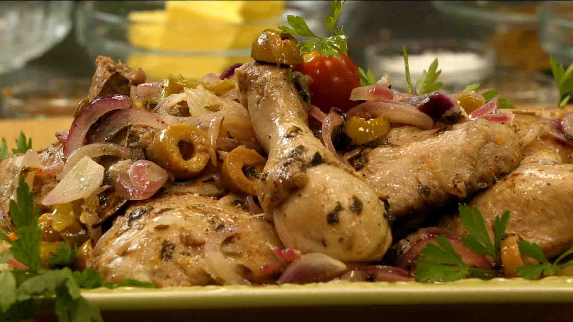 - في وعاء على النار نسخن زيت الزيتون ثم نضيف الثوم والبصل والدجاج ونقلب.